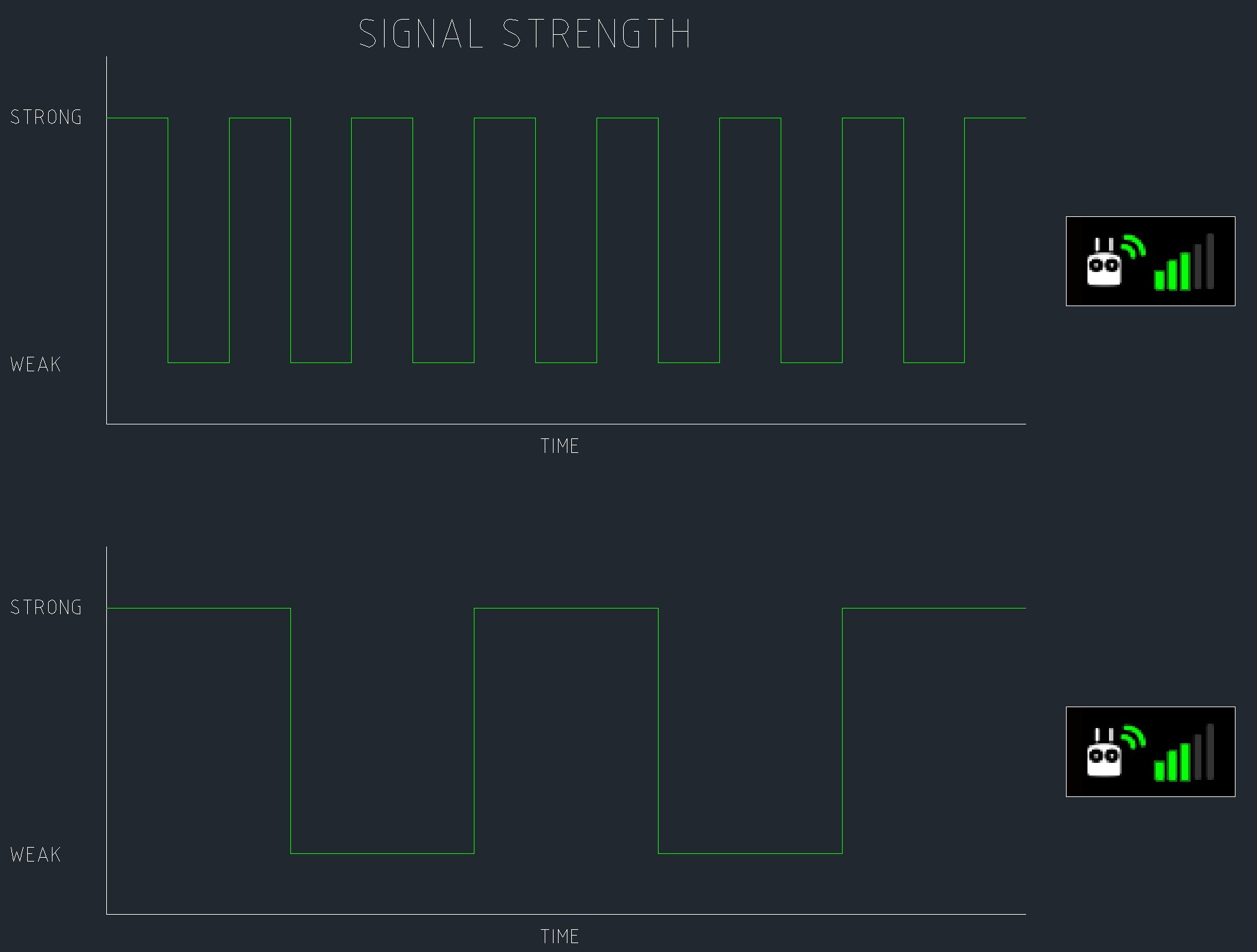 In both graphs the average signal strength is equal, however in the bottom graph the time the signal is weak/interrupted is too long to successfully complete a waypoint mission.