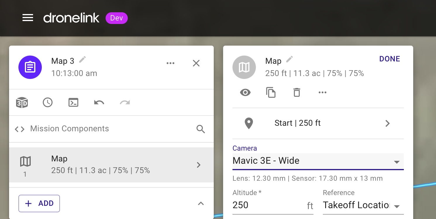 The FOV of the camera is automatically set when you choose a drone as specified by the specifications of that drone on DJI’s web page.