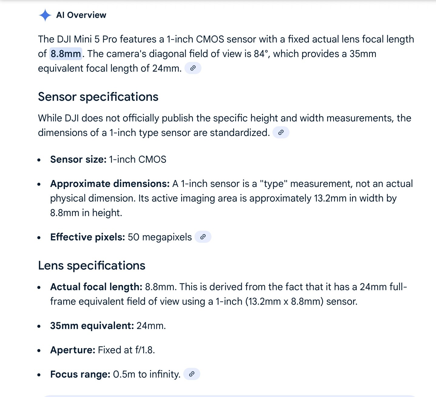 I found an article and it appears to be correct. The lens focal length is 8.8mm with a width of 13.2mm and height of 8.8mm. This sounds correct if compared to the Air2S which is a 1” sensor with the same height and width. The only difference is It has a 22mm camera so the focal length is at 8.5mm compared to the 24mm on the Mini 5 at 8.8. I believe this is right. Hope that helps. Enjoy.