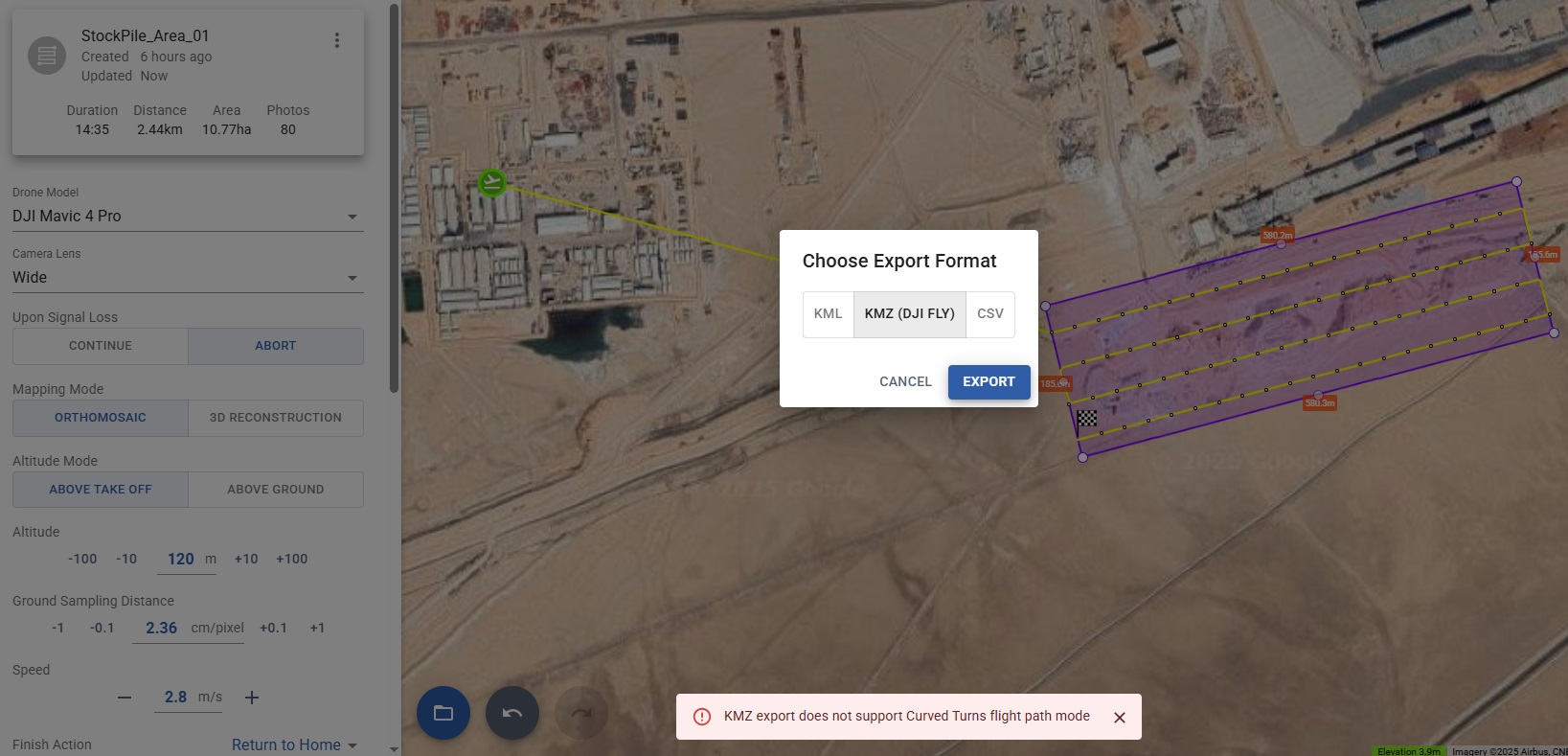 But, for my Mavic 4 pro, when I select “Curved Turns” instead of straight path and try to export KMZ (dji fly), the mission hub ends up showing an error “KMZ export does not support Curved Turns flight path mode”.