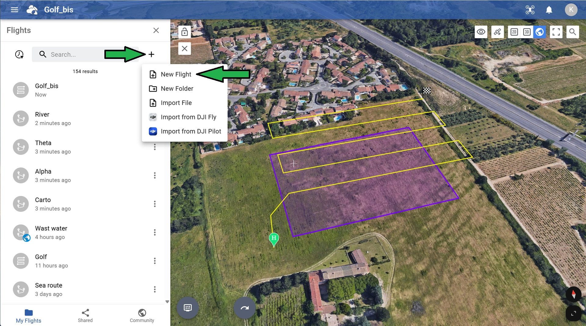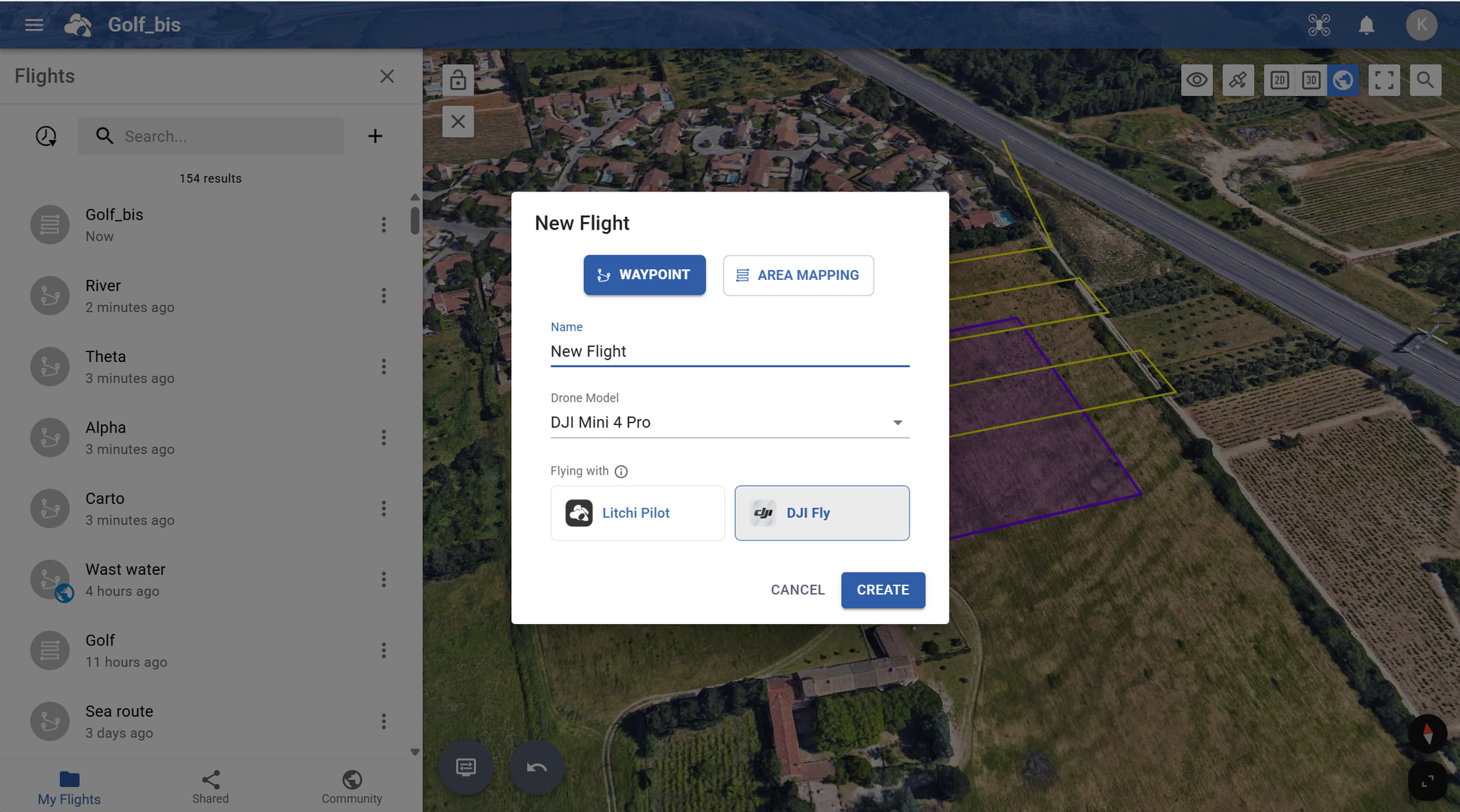 Head to https://hub.flylitchi.com/ and open the Flight Library (blue folder button in bottom left corner). Then click on “+” and “New Flight” to create your waypoint flight making sure to select your supported drone model and DJI Fly app in the prompt.