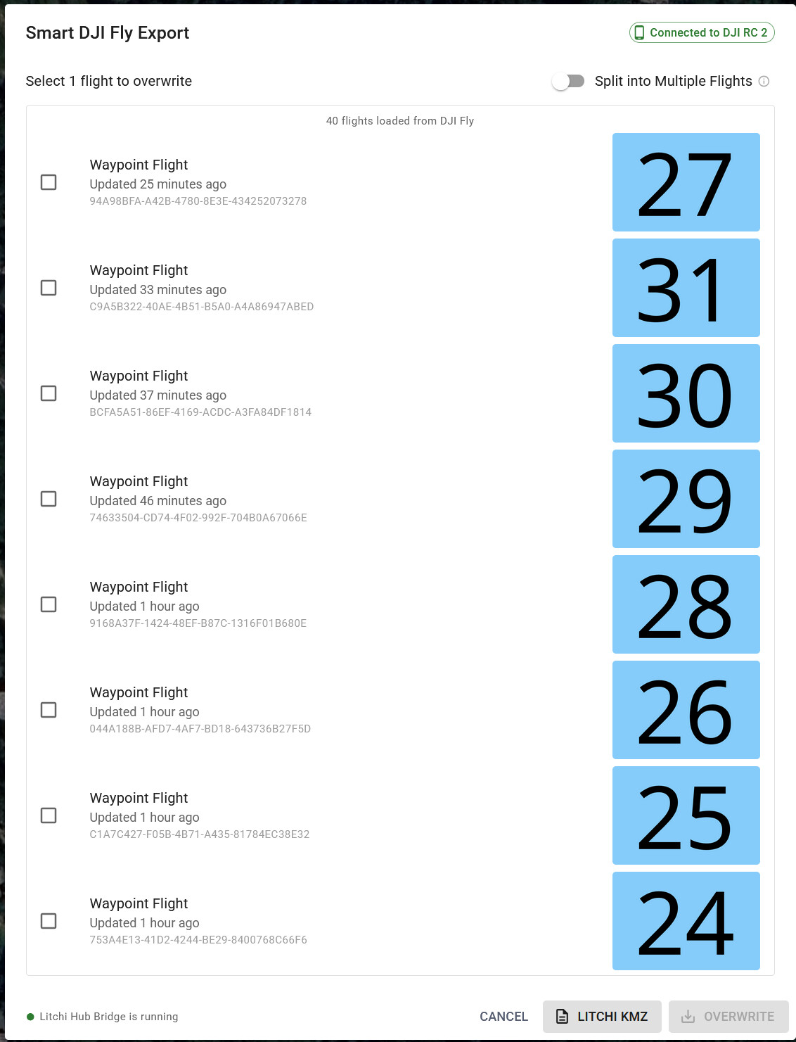 Litchi Hub Smart Export overwrites the preview image with the Litchi flight name, this is meant to help you find the flight. However since DJI Fly uses a cache for preview images (that we can’t clear), it can happen that DJI shows the old preview image still even after overwrite. The way to avoid this problem is by creating the dummy just before overwriting it (see step 2 in the guide at [GUIDE] How to use Litchi Hub with DJI Fly / SkyRover). If you do that, then the preview image will update to the Litchi Hub preview image correctly, plus the dummy will have been just created making it easy to find anyway since it’s the first one in the list in DJI Fly.