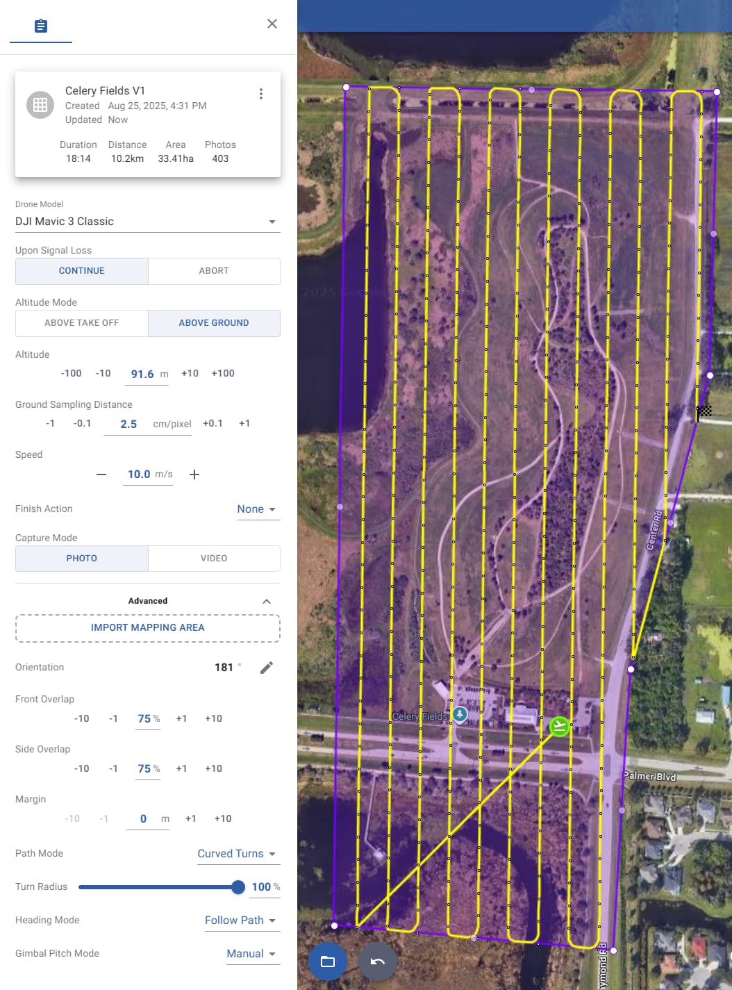 Sorry, I should have mentioned that I’m using the RC Pro, soon to be modified RC Plus. I have take photo set, but also have gimbal tilt set to locked at 75 degrees. Should I change that to manual and just dial that in before the flight since the tilt never changes? Here’s how I have it now, with curved turns to maybe help it out. Never mind about the curved turns, I realized that’s not supported on KMZ export.