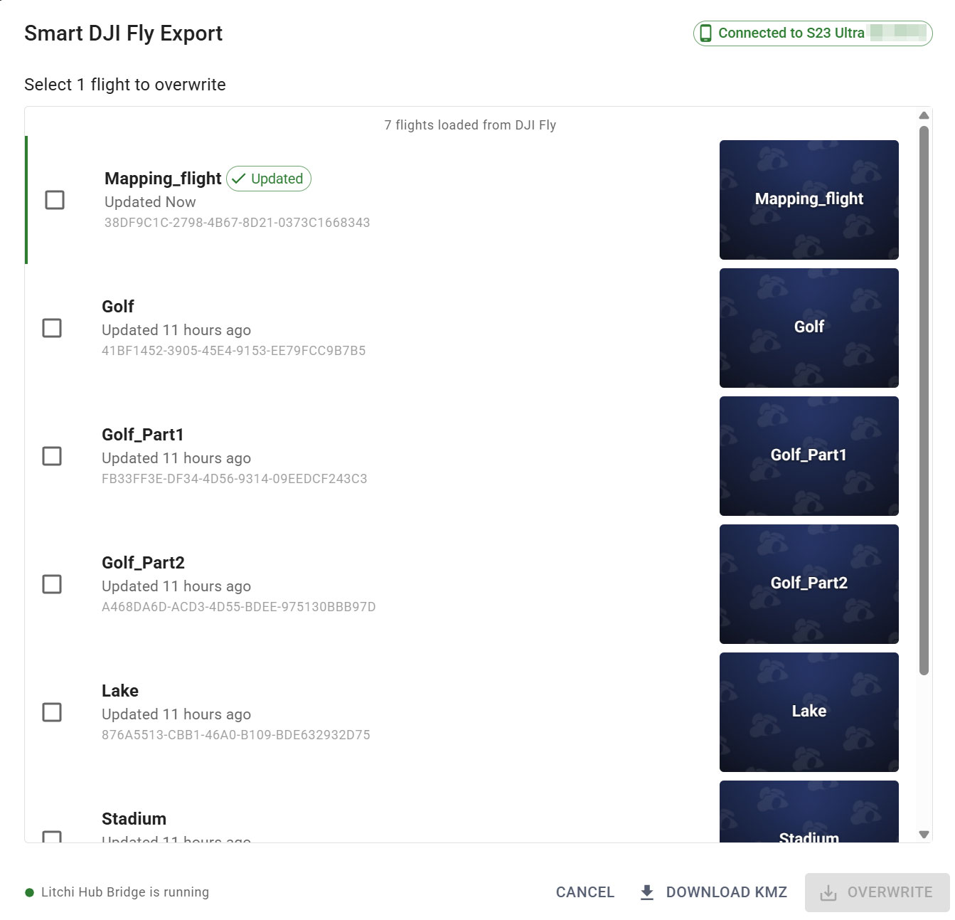 Export flights directly to DJI Fly using Litchi Hub Bridge.