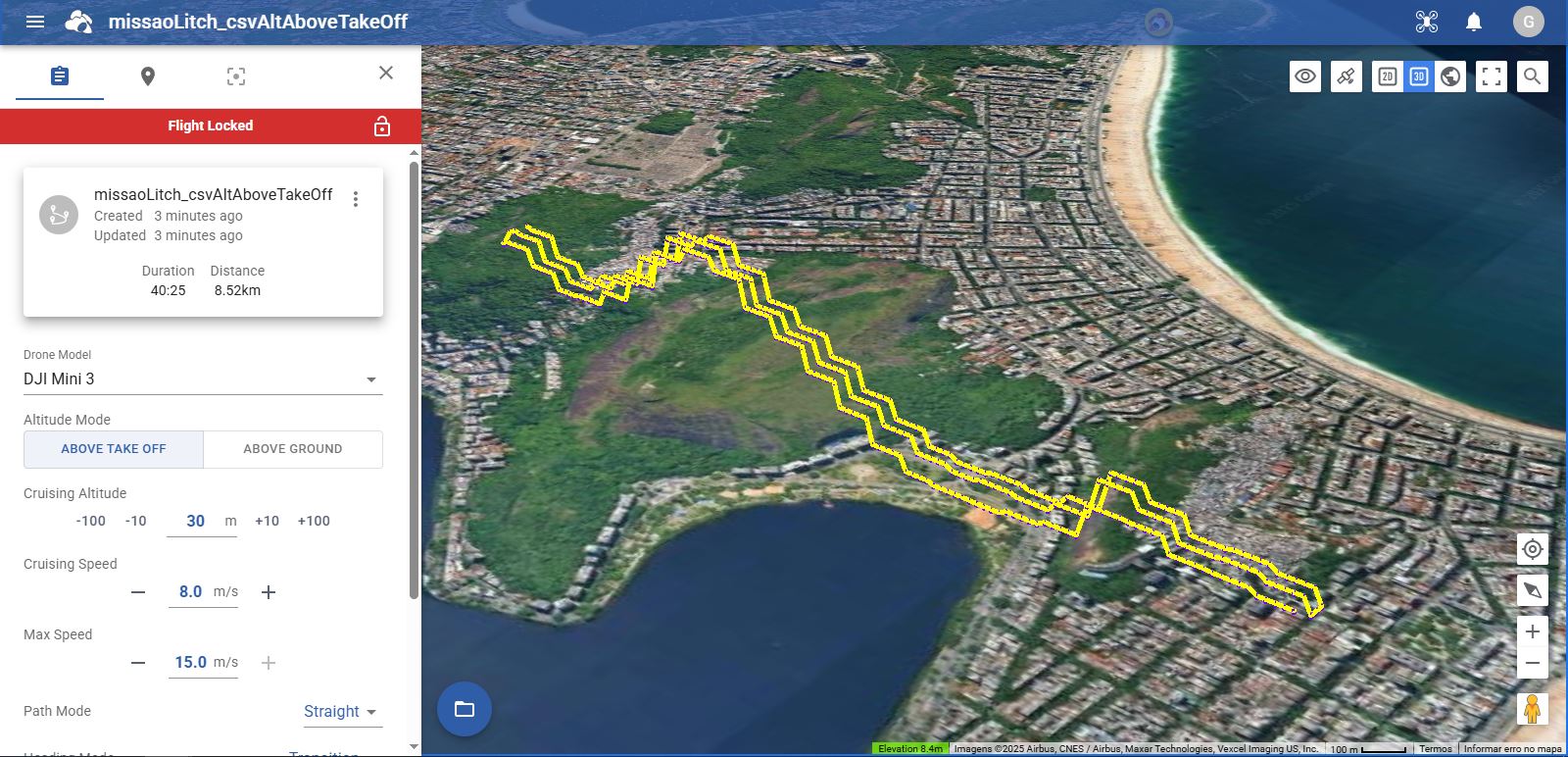 CSV gerado pelo plugin e importado no Litch, com altitude Above Ground.